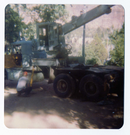 Worker leaning on bridge materials during the arrival and emplacement of three new footbridges in Zion Canyon. ; ZION Museum and Archives Image 005.06.06-6of12 ; ZION 15933