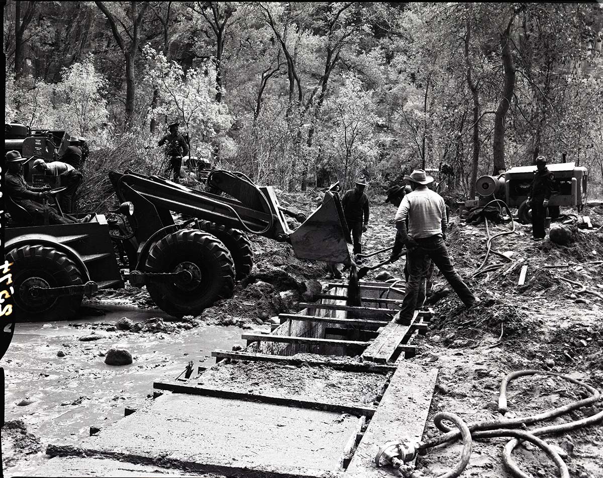 Water supply system- crews and equipment pouring concrete of underpass for water pipe under Virgin River at the Temple of Sinawava. ; ZION Museum and Archives Image 006_04_136 ; ZION 8023