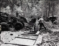 Bulldozer widening catchment area at top of pipeline - Springdale water system. Two men seated on hillside watching.
