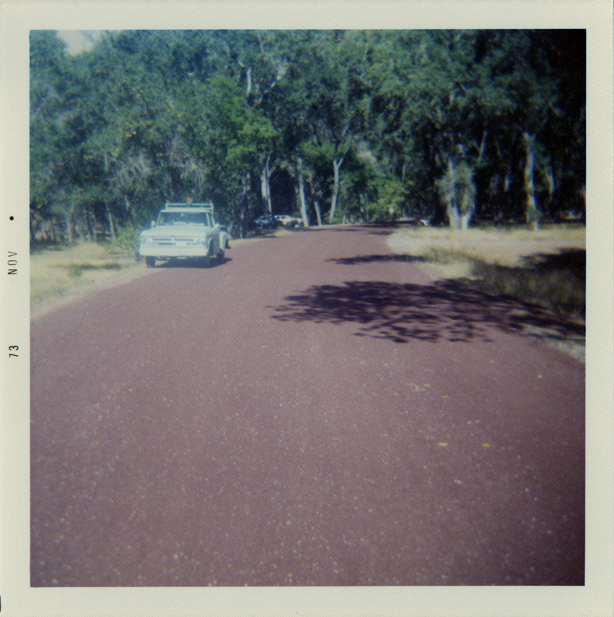 Trailer driving along road near crack in need of fixing. ; ZION Museum and Archives Image 002.12.02-8of31 ; ZION 15933
