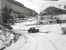 Snowplow accident, county line curve along East Entrance road showing vehicle that slid into snow plow and skid marks. ; ZION Museum and Archives Image 107_05_044 ; ZION 8497