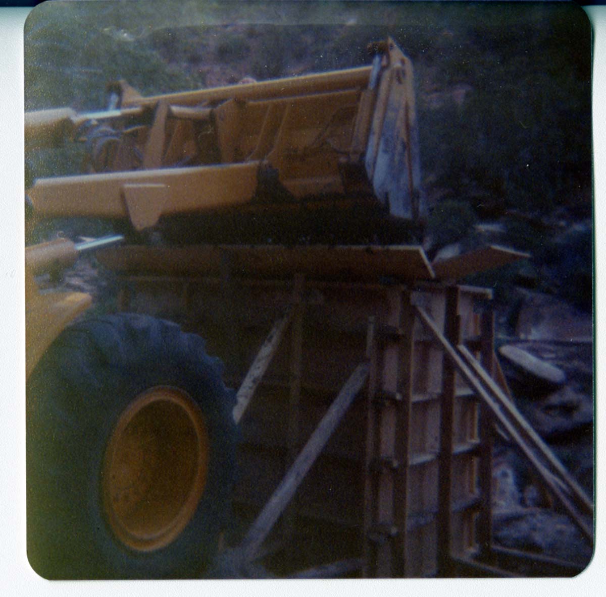 Construction vehicle during the arrival and emplacement of three new footbridges in Zion Canyon. ; ZION Museum and Archives Image 005.06.06-9of12 ; ZION 15933