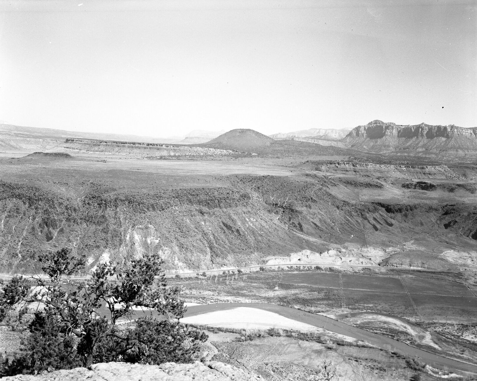 Crater Hill from mesa above Grafton, Utah. ; ZION Museum and Archives Image ZION 14877 ; ZION 15933