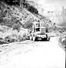 Grader clears flood debris off road near South Entrance. ; ZION Museum and Archives Image ZION 8563 ; ZION 8563