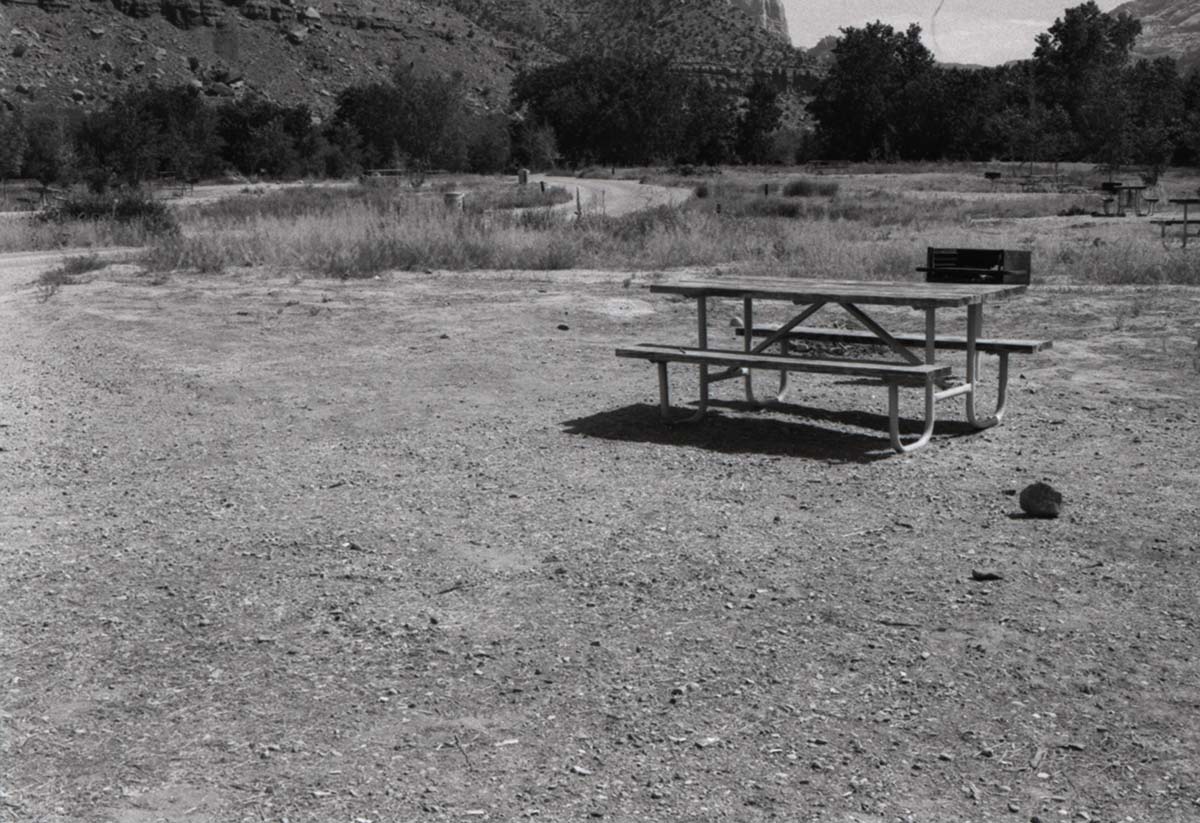 Picnic table and grill at a campsite in the Watchman Campground. ; ZION Museum and Archives Image 003.01.01-21of22 ; ZION 15933