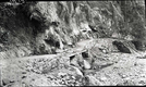 Narrows Trail construction, station 31-25, with parapet stones not yet cemented into place-ready for the second spray and top coat of fine gravel. ; ZION Museum and Archives Image 008_03_030 ; ZION 13608