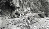 Narrows Trail construction with rolling finished, four workers take a break at a rock cut. ; ZION Museum and Archives Image 008_03_034 ; ZION 13612