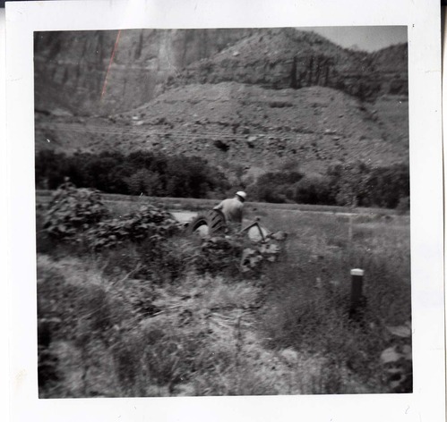 Park employee mowing on the tractor. ; ZION Museum and Archives Image 006.06.08-1of5 ; ZION 15933