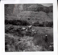 Park employee mowing on the tractor. ; ZION Museum and Archives Image 006.06.08-5of5 ; ZION 15933