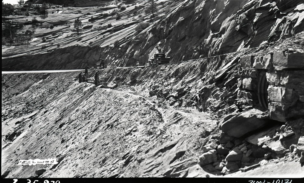 Workers engaged in bank stabilization above the Zion Mt Carmel Highway. ; ZION Museum and Archives Image 002_02011 ; ZION 15933