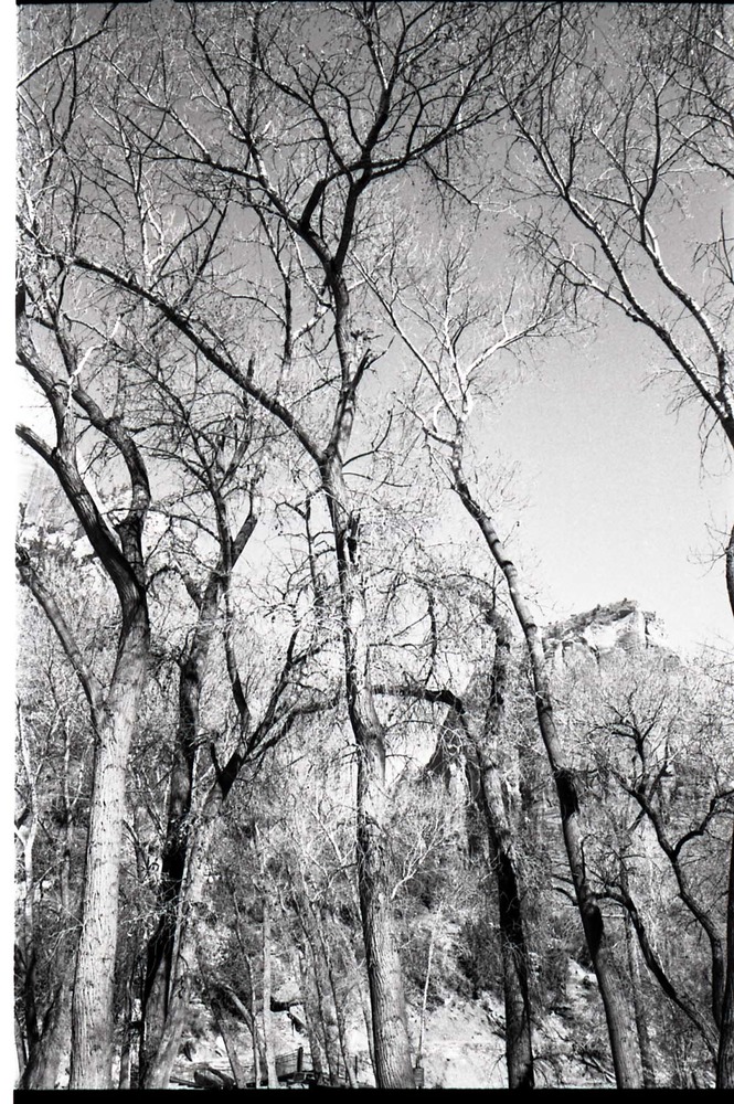 BW photos of trees. Virgin River in foreground. ; ZION Museum and Archives Image 302_04_02026 ; ZION 15933