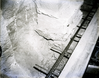 Galleries 1 & 6 under construction, stairway suspended on iron bars protruding from cliff shows to right of gallery #6 blacksmith, compressor, and transformer houses on trail around talus slope. ; ZION Museum and Archives Image 002_02025 ; ZION 10187