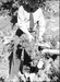 Basket dam #2 construction along the Virgin River with a view of workers unloading boulders from the bed of a pickup truck. ; ZION Museum and Archives Image ZION 13642 ; ZION 13642