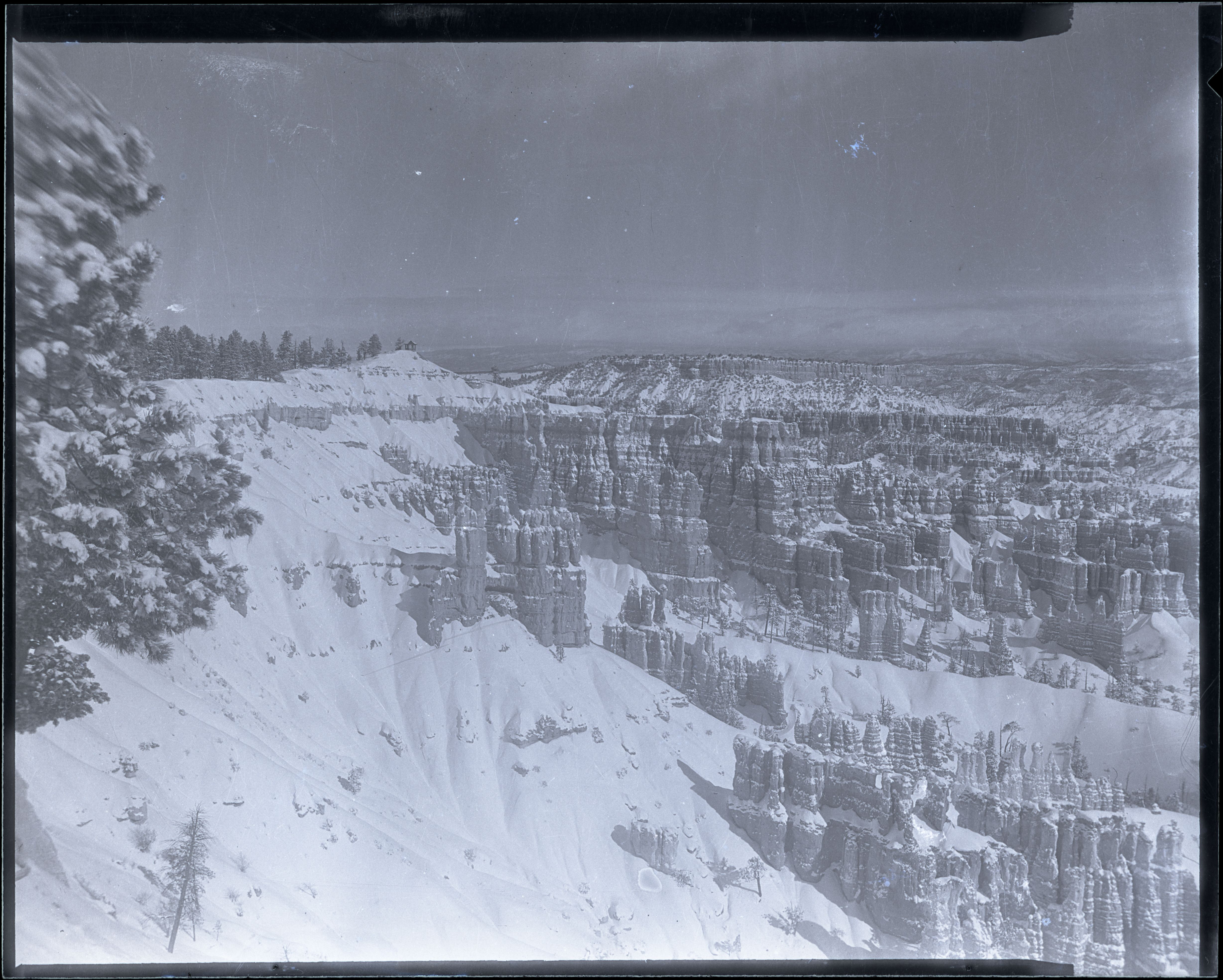 Nitrate negative of snow covered ampitheater and hoodoos from the rim in BRCA. Trees in foreground and on rim. ; BRCA Museum and Archives Image BRCA8875_001_542 ; BRCA 8875