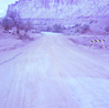 Dirt road with caution stand and Zion landscape in background. ; ZION Museum and Archives Image 002.12.03-9of12 ; ZION 15933