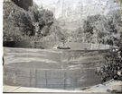 Wooden scaffolding and workers used for upgrade of water system at Temple of Sinawava. ; ZION Museum and Archives Image 006_04_159 ; ZION 15933