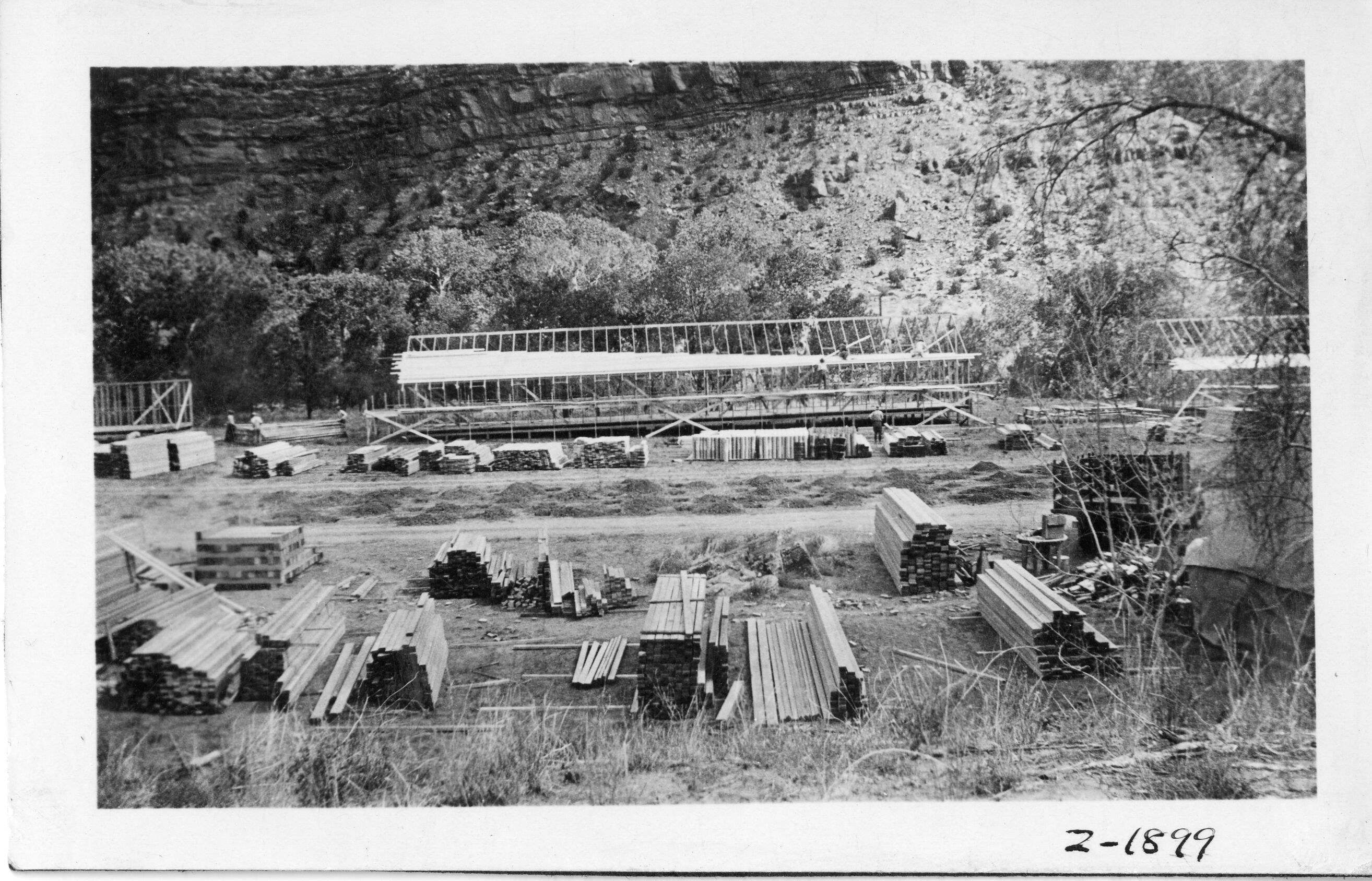 B&W PHOTOGRAPH OF THE CONSTRUCTION OF THE WAREHOUSE AND FIREHOUSE LOCATED IN OAK CREEK.; **NOTE: ERROR IN LOCATION OF PHOTOGRAPH, IT IS ACTUALLY THE CCC CAMP AT NP2 NEAR BRIDGE MOUNTAIN, THE BUILDINGS ARE THE BARRACKS. PHOTO CUT FROM PHOTO ALBUM IMAGE ON REVERSE, DISCOLORED AND FADED. ORIGINAL CATALOGER: WOOD, ROBERT J. 10DEC1986 ZION 603/01_24
