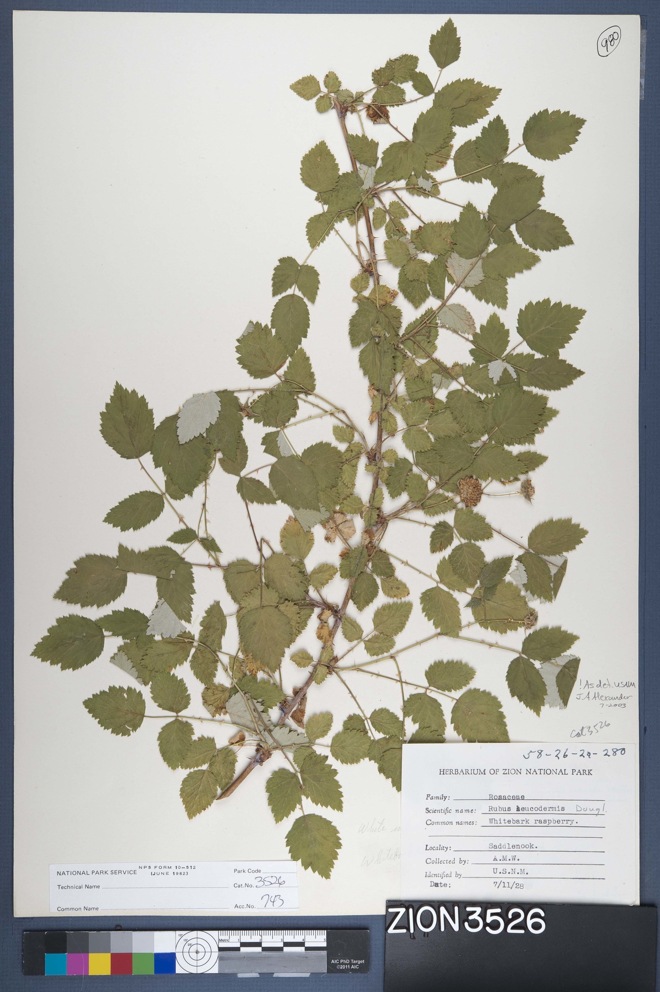 Rubus leucodermis, Whitebark raspberry. Collected by Angus M. Woodbury, 07-11-1928. Catalogued by Margaret Malm, 1988.