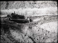 Bulldozer widening catchment area at top of pipeline - Springdale water system. Two men seated on hillside watching. ; ZION Museum and Archives Image 006_04_012 ; ZION 8211
