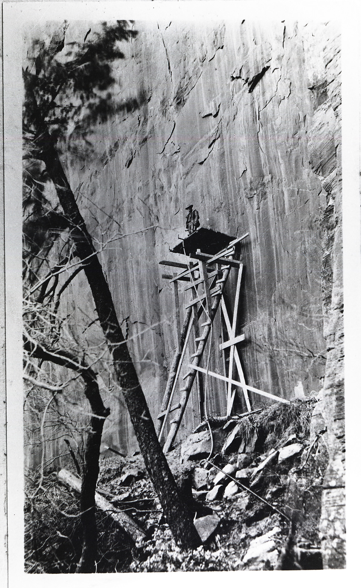 Galleries 1 & 6 under construction, stairway suspended on iron bars protruding from cliff shows to right of gallery #6 blacksmith, compressor, and transformer houses on trail around talus slope. ; ZION Museum and Archives Image 002_02025 ; ZION 10187