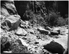 BW photo of a rock slide along the Narrows Trail. ; ZION Museum and Archives Image 107_06_09005 ; ZION 15933
