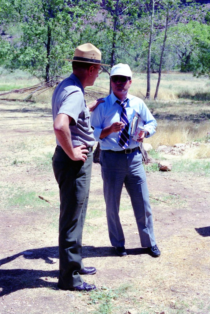 Color Photos of the parks 72nd anniversary celebrations- cake cutting, barbecue, speakers. Superintendent Harold Grafe serving cake. ; ZION Museum and Archives Image 800_21_01022 ; ZION 15933
