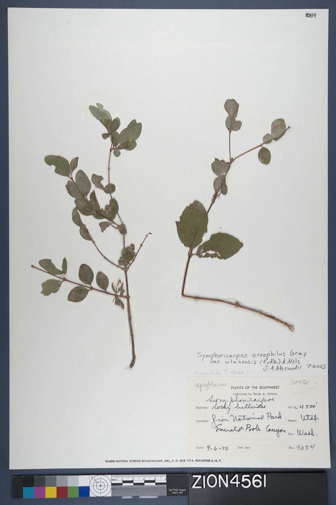 Symphoricarpos oreophilus var. parishii, Utah snowberry. Collected by Ruth A. Nelson, 06-09-1970. Catalogued by Margaret Malm, 1988.