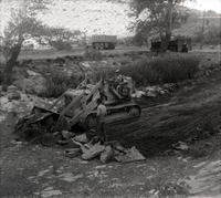 Tractor clearing road of rocks and debris along the scenic canyon drive near the Grotto. ; ZION Museum and Archives Image 002.03.05-35of37 ; ZION 15933