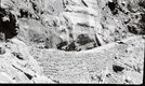 Narrows Trail construction, station 29-50, with view of dry wall, overhanging rock, and travertine limestone cut. ; ZION Museum and Archives Image 008_03_029 ; ZION 13607
