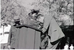 BW Photos of the Zion Lodge Rededication Ceremony. Superintendent Harold (Harry) Grafe speaking with man and woman. ; ZION Museum and Archives Image 800_20_01007 ; ZION 15933