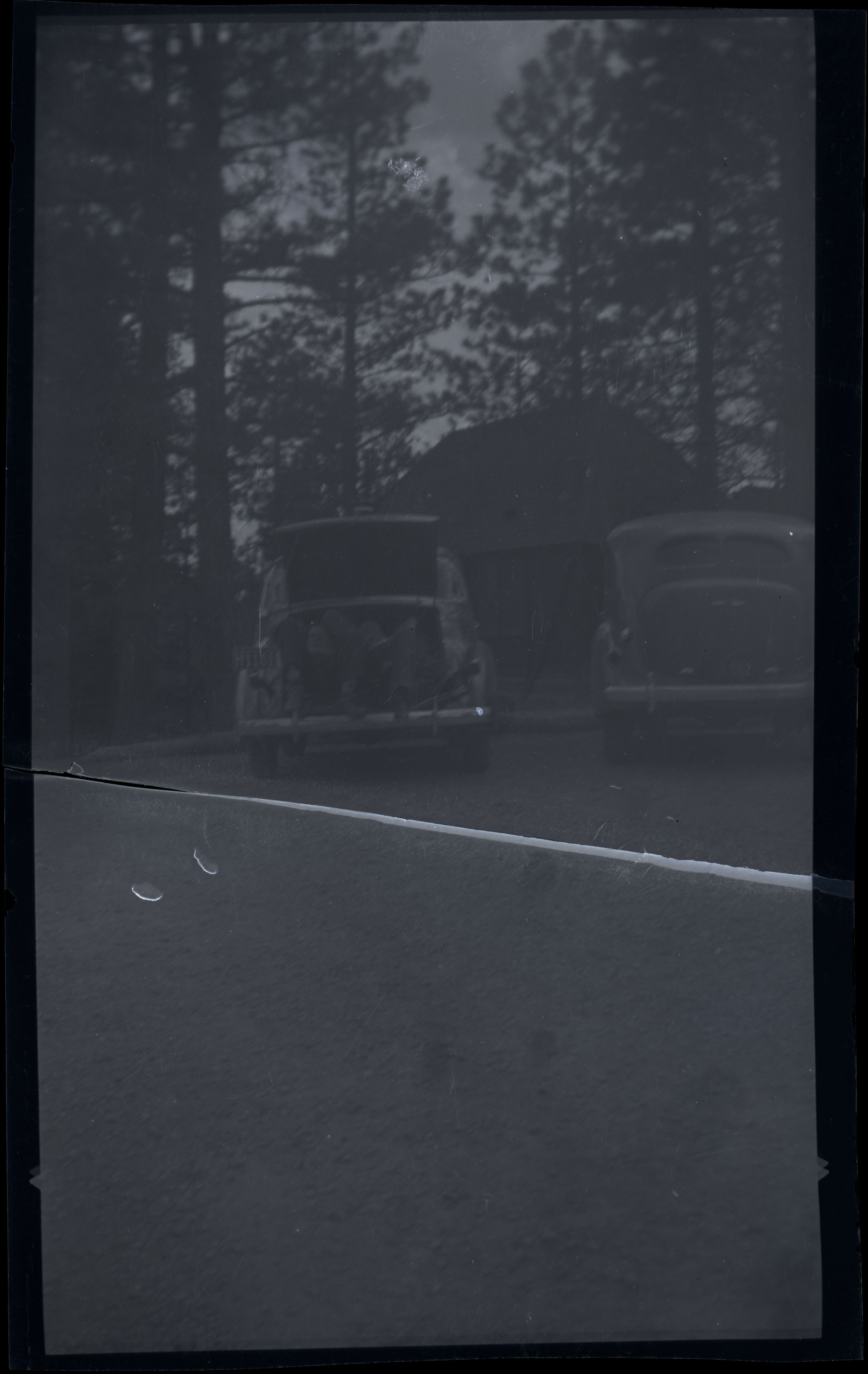 Nitrate negative of parking lot in BRCA. Two passenger vehicles facing away from the camera. Two men lying in the trunk of one of the vehicles. Small building behind vehicles, possibly a NPS cabin. ; BRCA Museum and Archives Image BRCA8875_001_154 ; BRCA 8