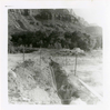 Workers place pipe on side of bridge during the Watchman housing utility project. ; ZION Museum and Archives Image 006.04.13-16of17 ; ZION 15933
