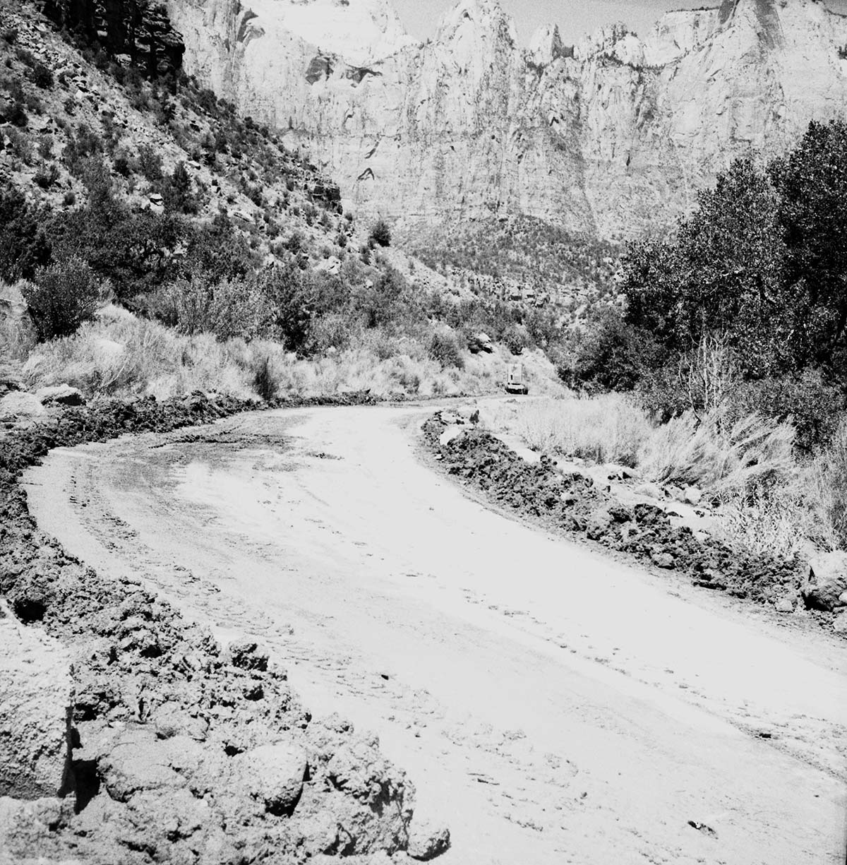 Mud and rock slides on park road. ; ZION Museum and Archives Image ZION 8619 ; ZION 8619