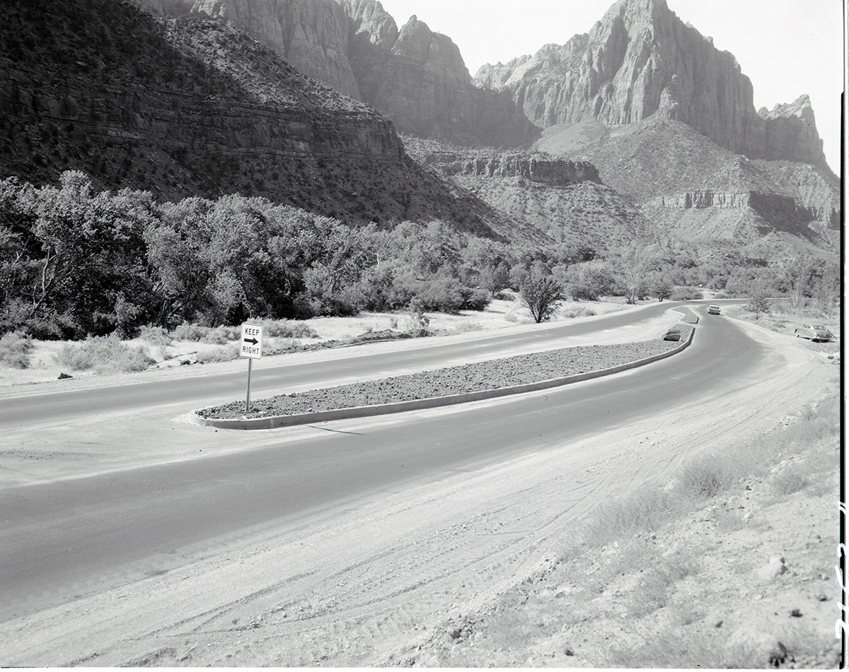 Traffic separator for the realignment of Highway 1 (park highway, State Route 9), at Mission 66 Visitor Center and Museum. ; ZION Museum and Archives Image 002_10026 ; ZION 7539