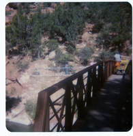 Man crossing the new Grotto footbridge after its placement on stone abutments. ; ZION Museum and Archives Image 005.06.02-30of53 ; ZION 15933