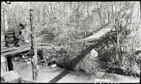Park ranger checking cable on Birch Creek trail suspension bridge over Virgin River. ; ZION Museum and Archives Image 008_13_007 ; ZION 13517