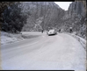 Snowplow accident, county line curve along East Entrance road showing vehicle that slid into snow plow and skid marks. ; ZION Museum and Archives Image 107_05_049 ; ZION 8502
