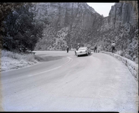 Auto accident: Nevada switchback (Zion-Mt. Carmel Highway), snow and ice, car driven by Jerrold Bringhurst collided with NPS truck. ; ZION Museum and Archives Image 107_05_014 ; ZION 8461