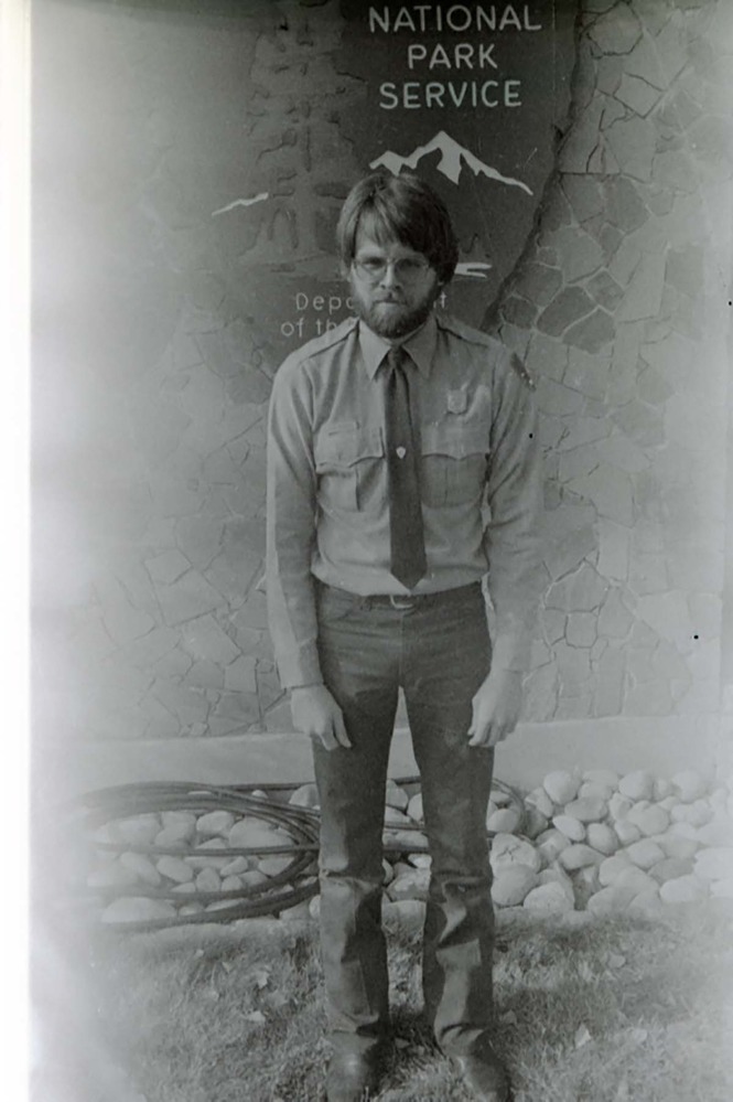 Man with beard pointing to National Park Service arrowhead. ; ZION Museum and Archives Image 402_11_13004 ; ZION 15933