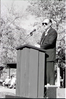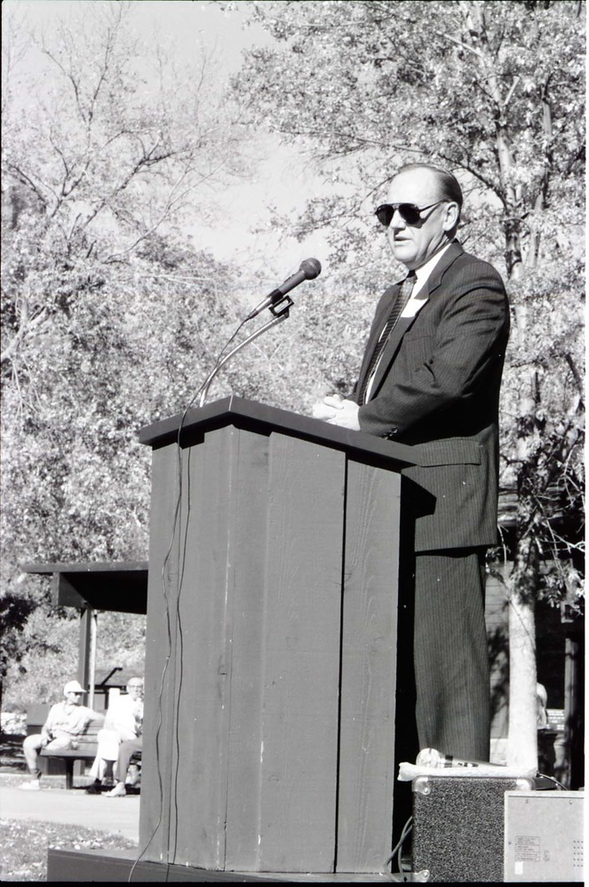 BW Photos of the Zion Lodge Rededication Ceremony. Superintendent Harold (Harry) Grafe speaking with man and woman. ; ZION Museum and Archives Image 800_20_01007 ; ZION 15933