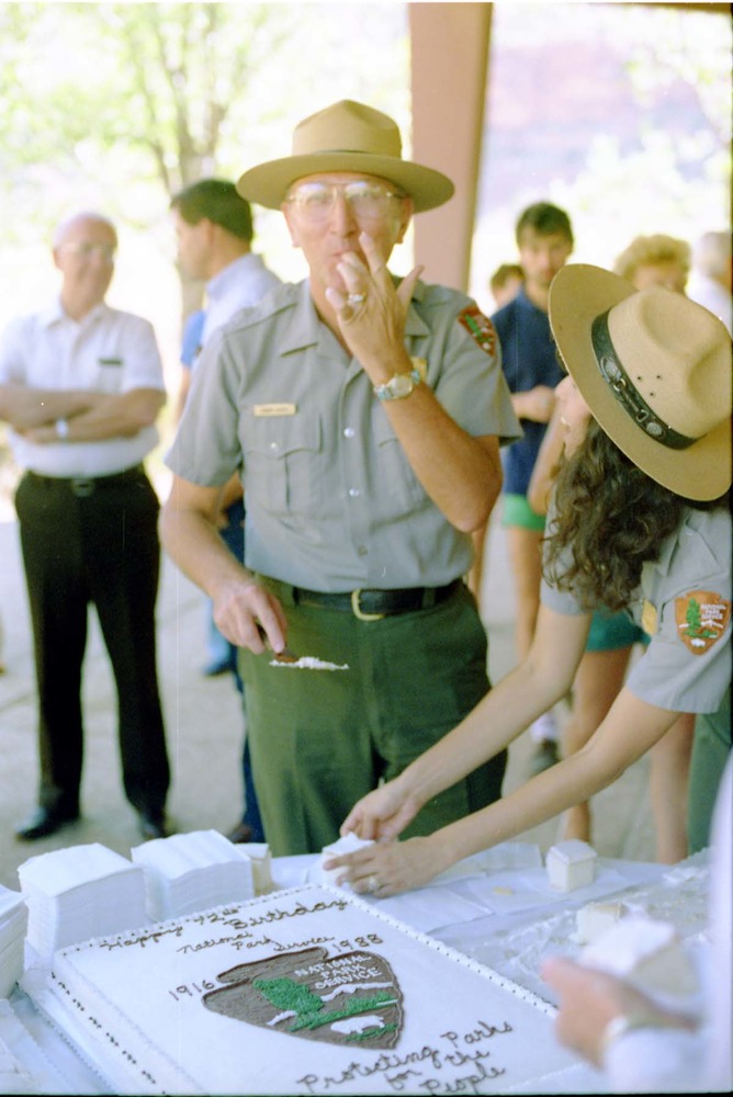 Color Photos of the parks 72nd anniversary celebrations- cake cutting, barbecue, speakers. Superintendent Harold Grafe serving cake. ; ZION Museum and Archives Image 800_21_01022 ; ZION 15933