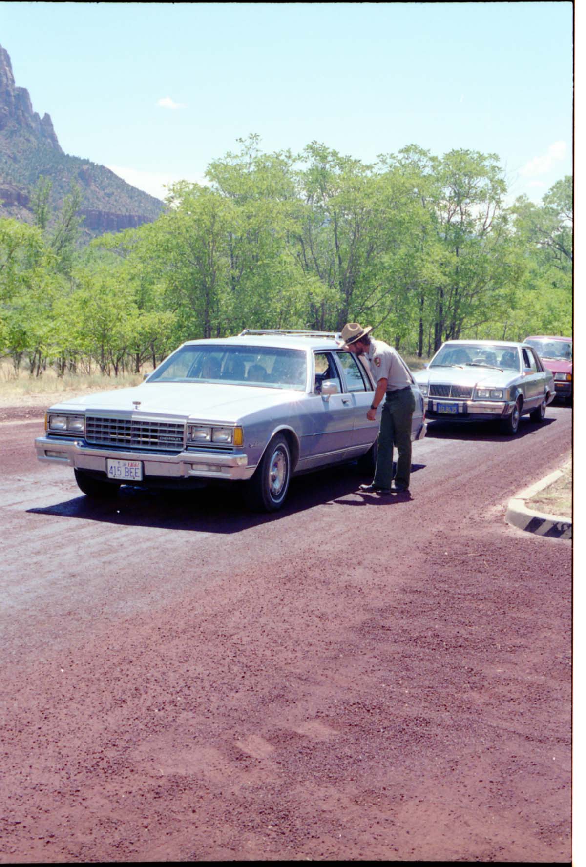 Color Photos of the parks 72nd anniversary celebrations- cake cutting, barbecue, speakers. Superintendent Harold Grafe serving cake. ; ZION Museum and Archives Image 800_21_01022 ; ZION 15933