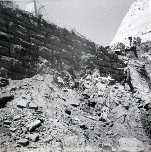 Brick retaining wall along East Rim road during repairs. ; ZION Museum and Archives Image 002.05.01-13of19 ; ZION 15933