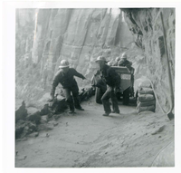 Workers operating construction equipment during the West Rim trail half tunnel maintenance/stabilization. ; ZION Museum and Archives Image 008.01.01-24of25 ; ZION 15933