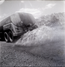 Side view of tanker truck spraying Kolob Canyon Road for chipsealing project. ; ZION Museum and Archives Image 002.12.06-5of20 ; ZION 15933