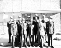 Ten uniformed personnel, in-service training. Left to right, back: John Bradbury, Charles H. McCurdy, James B. Felton, L. Hoener, Rudy Lueck; front: Carl E. Jepson, B. Hazeltine, R. Stevens, Superintendent Oberhansley.