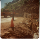 Men operating construction vehicles to clear rocks from road. ; ZION Museum and Archives Image 002.12.05-20of23 ; ZION 15933