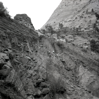 Brick retaining wall along East Rim road during repairs. ; ZION Museum and Archives Image 002.05.01-13of19 ; ZION 15933