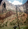 Arborist with harness pruning branches of tree, Bridge Mountain and Watchman in background. ; ZION Museum and Archives Image 107_02_02006 ; ZION 15933