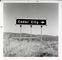 Cedar City' road sign near Kolob Canyon. ; ZION Museum and Archives Image 007.01.01-2of73 ; ZION 15933